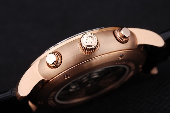 Crown: 18k Rose-Gold Plated Cutwork Crown med Audemars Piguet Logo og to mindre trykknapper på begge sider af den – tykkelse: 12 mm