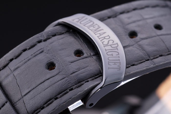 Armbånd: Sort Crocodile Læderrem med varmeprægede Audemars Piguet Navn og Logo og A Audemars Piguet Indskrevet Ionplettet Flip-Over Hook Clasp