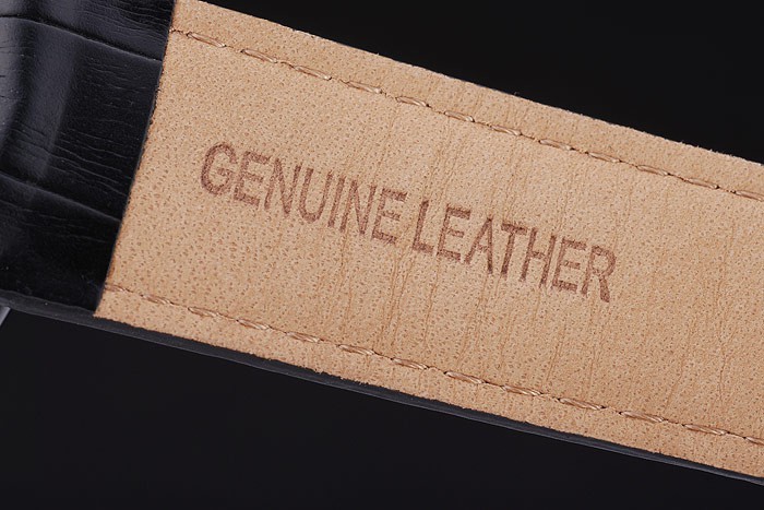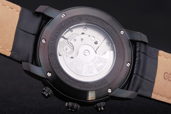 Armbånd: Sort Crocodile Læderrem med hvid trådsting og varmeprægede Audemars Piguet Navn og Logo og et Audemars Piguet Indskrevet Ionplettet Flip-Over Hook Clasp