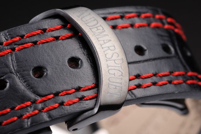 Armbånd: Varmeprægede Audemarer Piguet Sort Krokodille Læderrem med dobbelt rød Stitching og Audemarer Piguet Graveret ionbelagt foldet lås