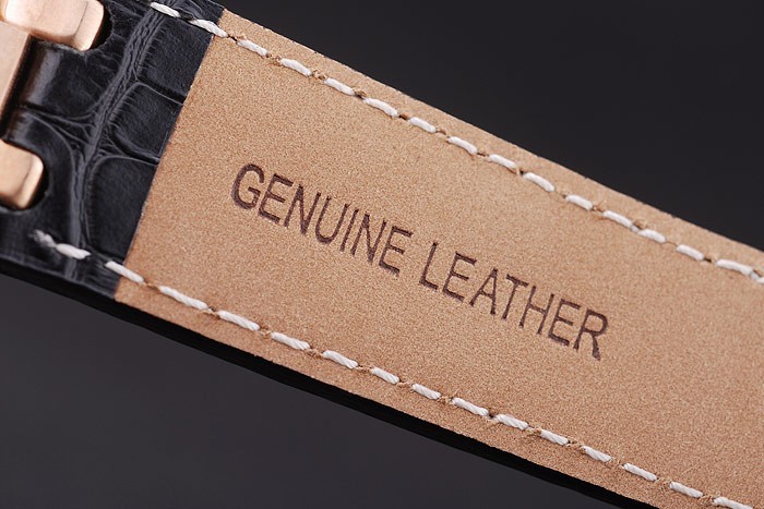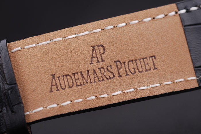 Armbånd: Sort Crocodile Læderrem med hvidt trådsting og varmeprægede Audemars Piguet Navn og Logo og et Audemars Piguet Indskrevet Roseforgyldt Flip-Over Hook Clasp