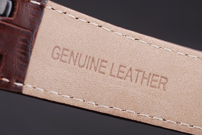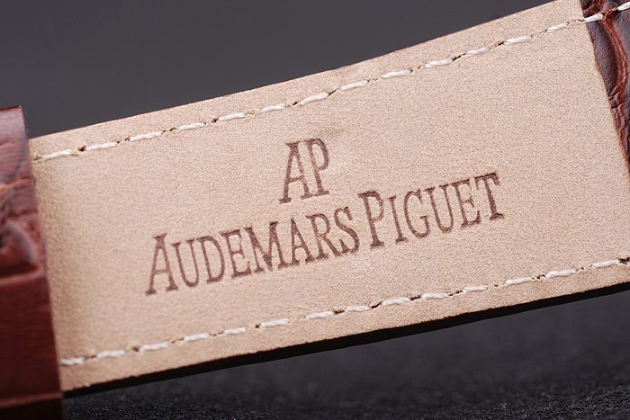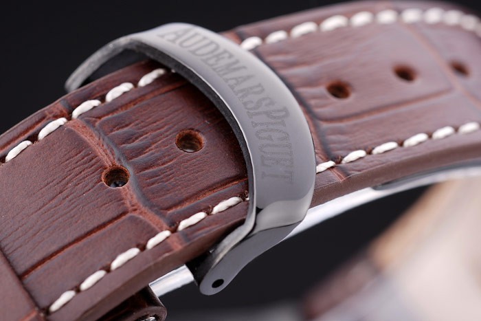 armbånd: mørk brun krokodille læderrem med hvidt trådsting og varmeprægede audemars piguetnavn og logo og et audemars piguet indskrevet ionplettet flip-over kroge lås