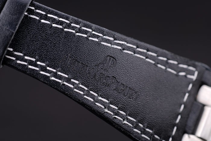 Armbånd: Varmeprægede Audemarer Piguet Swiss Made logo og sort læderrem med dobbelt hvid sømning tråd og audemarer Piguet indgraveret rustfrit stål Hook-Buckle Clasp