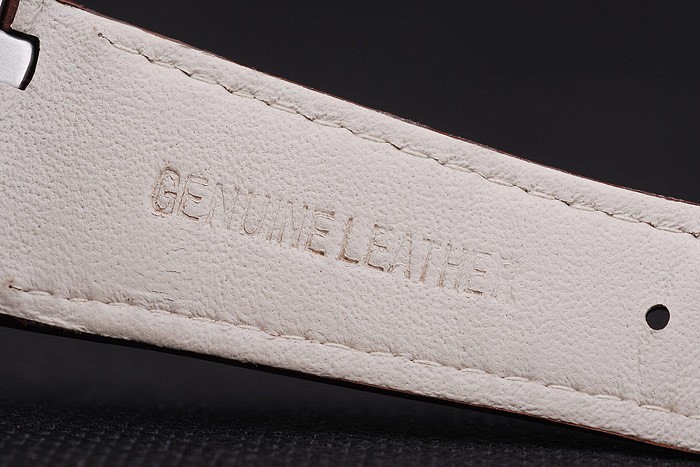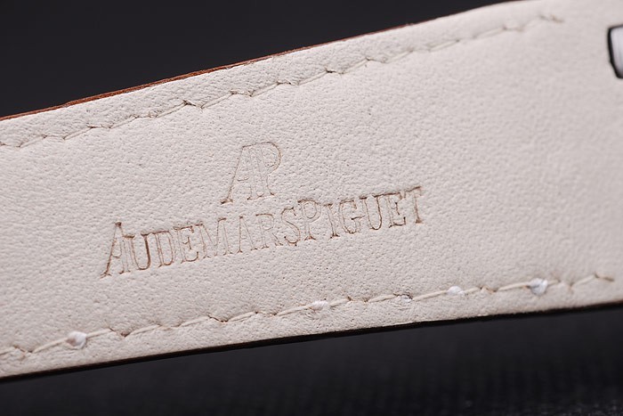 armbånd: brun krokodille læderrem med hvidt trådsting og varmeprægede audemars piguetnavn og logo og et audemars piguet indskrevet rustfrit stål flip-over kroge lås