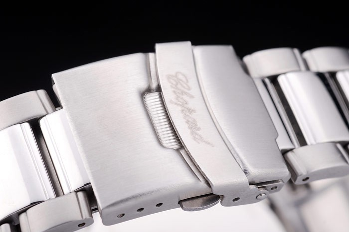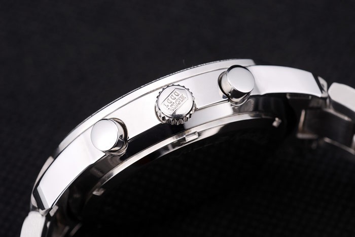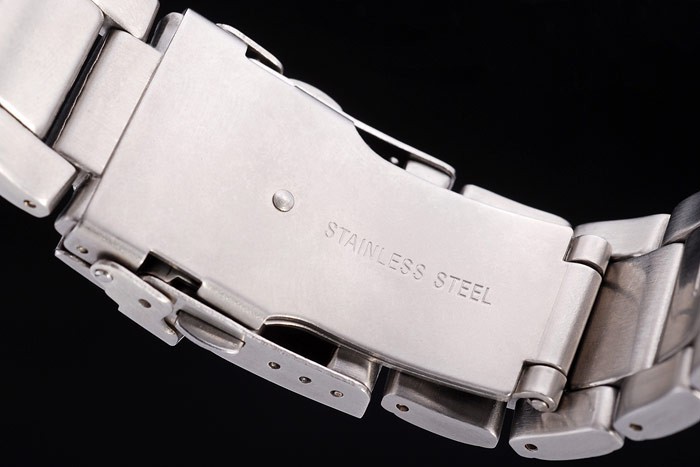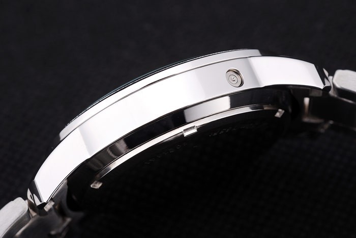 Crown: Poleret rustfrit stål krone indgraveret med rektangulære trykknapper på hver side af den