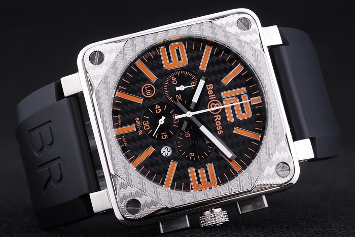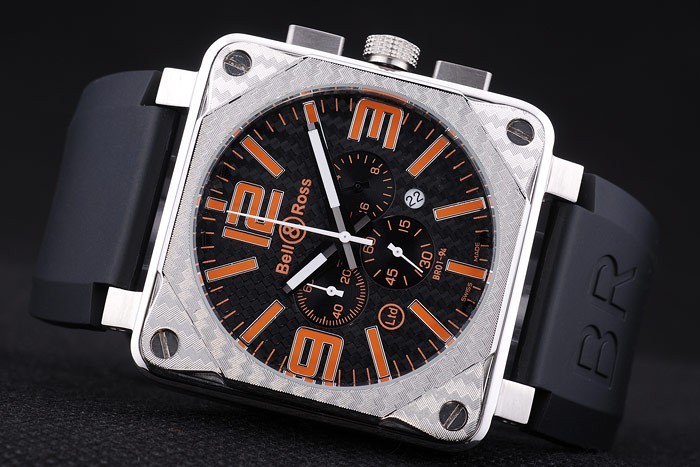 Armbånd: Varmeprægede Bell & Ross logo og produktkode Sort Gummirem med BR INCRISTED BRUSHED Rustfrit stål Hook-Buckle Clasp