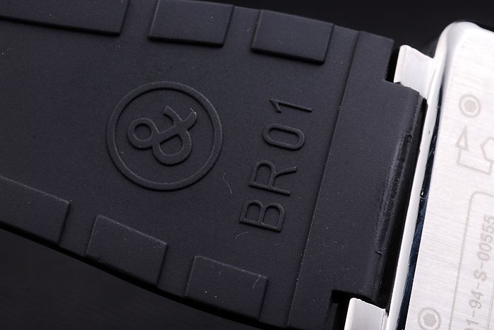 Armbånd: Sort Gummi-rem med varmeprægede logo, modelnummer og produktkode og BR indgraveret børstet rustfrit stål Hook-Buckle Clasp
