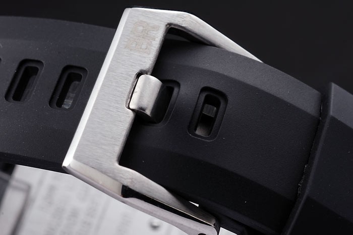 Armbånd: Sort Gummi-rem med varmeprægede logo, modelnummer og produktkode og BR indgraveret børstet rustfrit stål Hook-Buckle Clasp