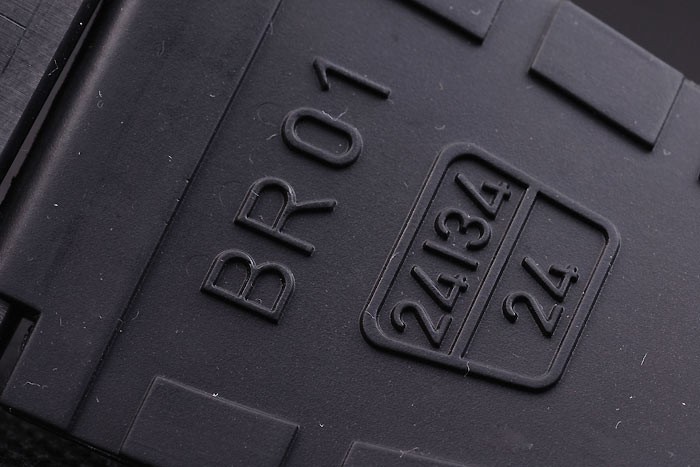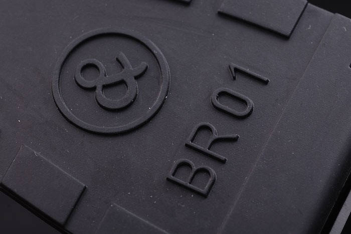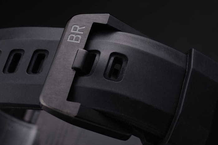 Armbånd: Sort Gummirem med varmeprægede logo, modelnummer og produktkode og BR-indgraveret ionbelagt krogspændelås