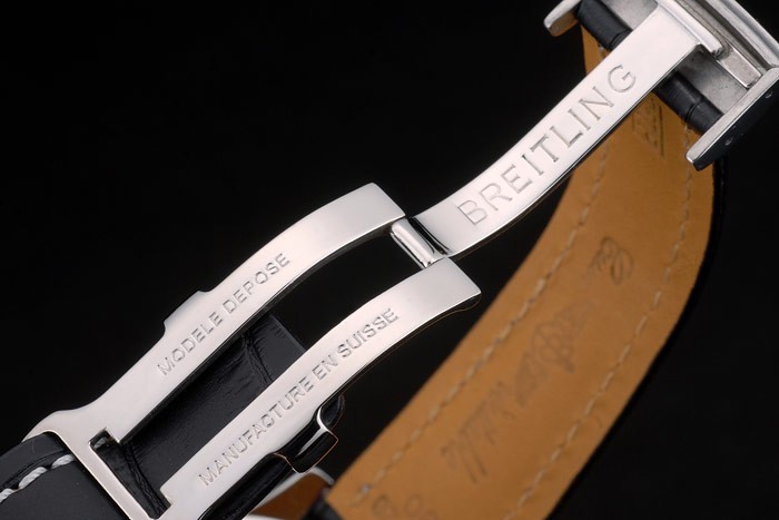 Armbånd: Breitling Varme Præget sort krokodille læderrem med hvidt trådsting og logo indgraveret poleret rustfrit stål fold-in lås
