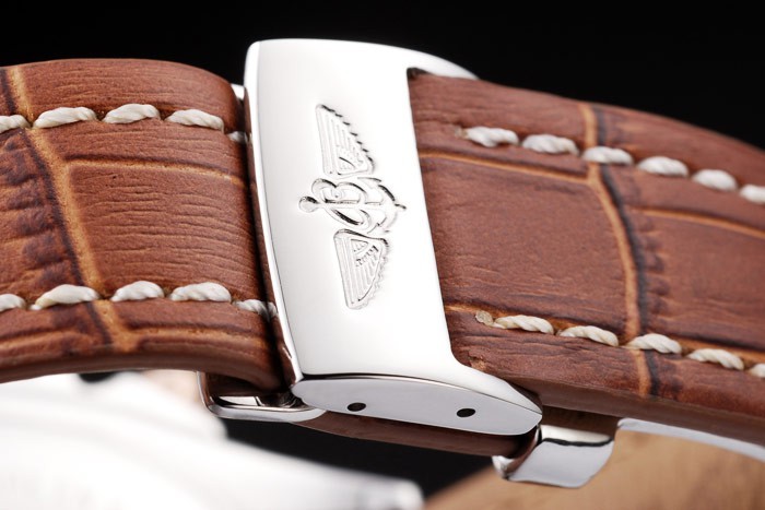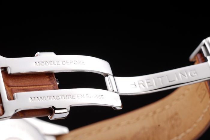 Armbånd: Brun krokodille læderrem med patenthvide søm og varmeprægede Breitling graveringer og indgraveret rustfrit stål Fold i lås med Breitling logo på toppen