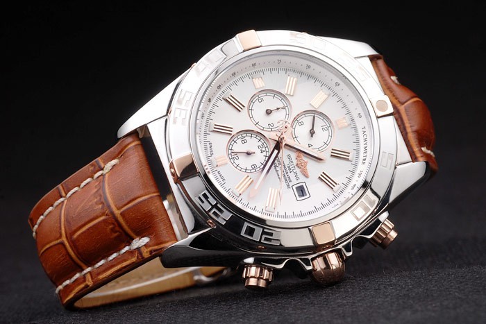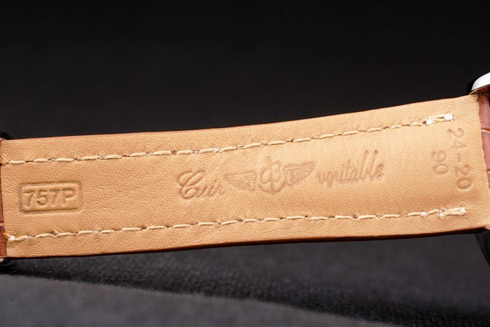 Armbånd: Brun krokodille læderrem med patenthvide søm og varmeprægede Breitling graveringer og indgraveret rustfrit stål Fold i lås med Breitling logo på toppen