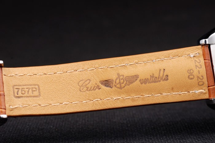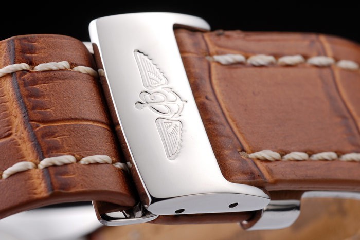 Armbånd: Brun krokodille læderrem med patenthvide søm og varmeprægede Breitling graveringer og indgraveret rustfrit stål Fold i lås med Breitling logo på toppen
