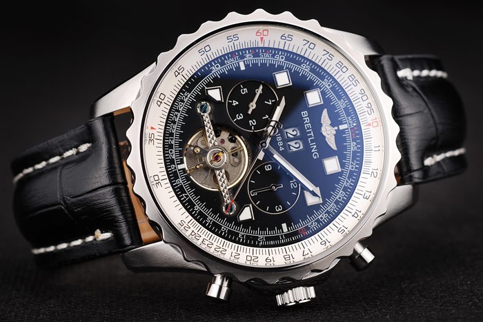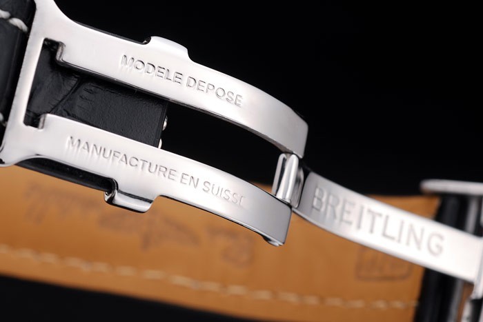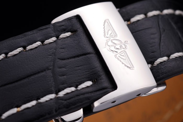 Armbånd: Varmekræftet Breitling Navn og logo Sort Crocodile Læderrem med hvid tråd Stiching og logo Indgraveret rustfrit stål Fold-in Clasp