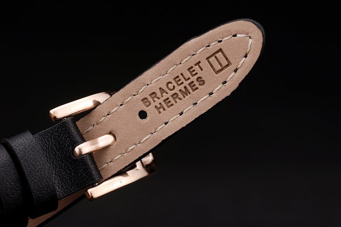 Armbånd: Langstrakt sort læderrem med varmeprægede frimærke og Hermes Hermes armbånd indgraveret Rose-forgyldt Hook-Buckle Clasp