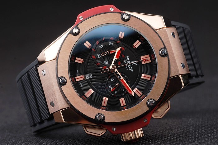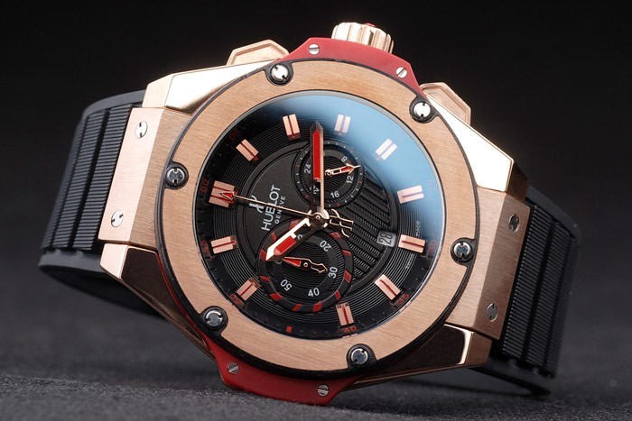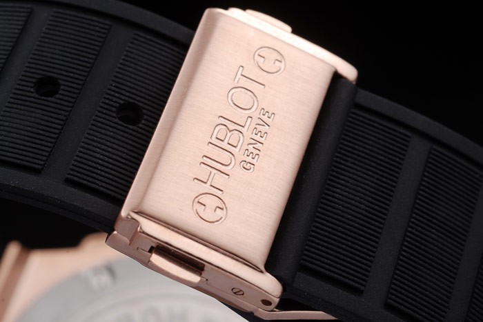 Armbånd: Textured Black Rubber Band med Rose-Gold Push-Button Hook Clasp og Hublot Gravings