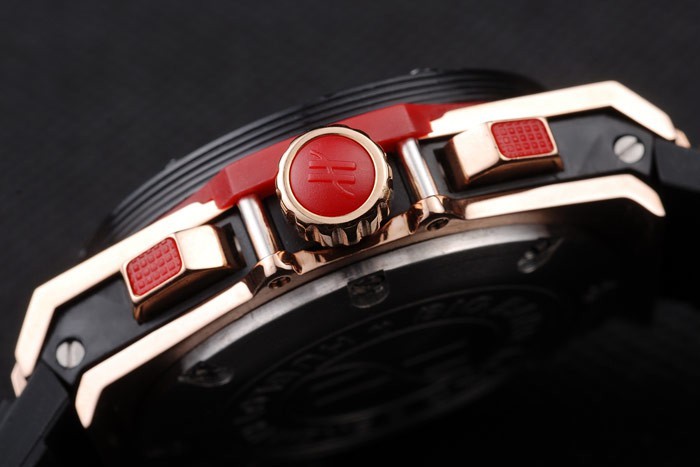 Crown: Cutwork Rose-Gold Crown med ‘H’ Gravering og to rektangulære trykknapper på begge sider, alle besat med røde gummi trimmings