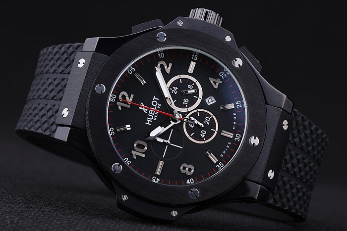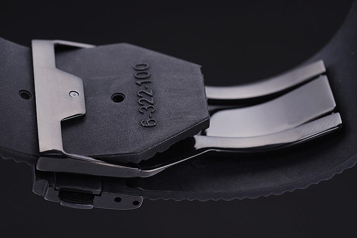 Armbånd: Tekstureret sort gummibånd med ionplettet trykknap Hook Clasp og Hublot Gravings