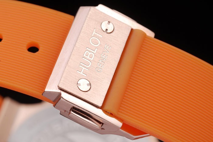 Armbånd: Tekstureret Orange Gummibånd med Rose-Gold Push-Button Hook Clasp og Hublot Gravings