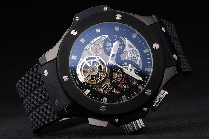 Tilbage: Rustfrit stål skruet ned tilbage med Hublot-indskrifter og gennemsigtigt center, der afslører mekanikken inden for Køn: Mænd