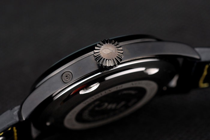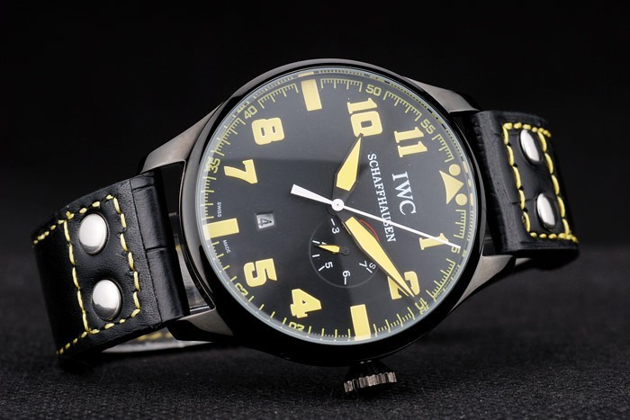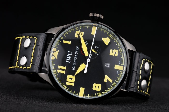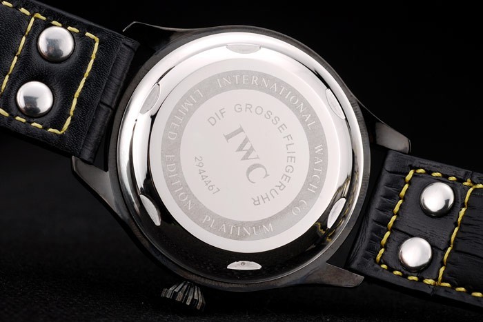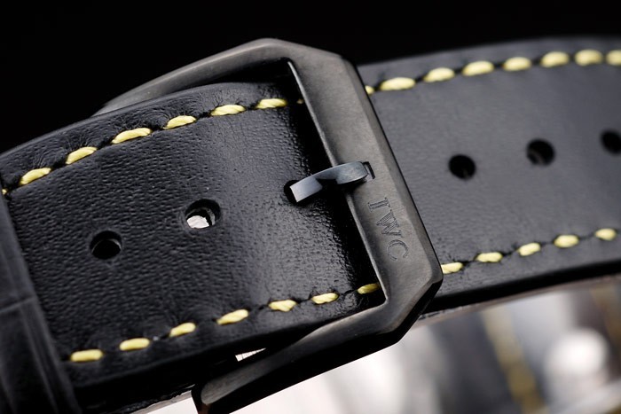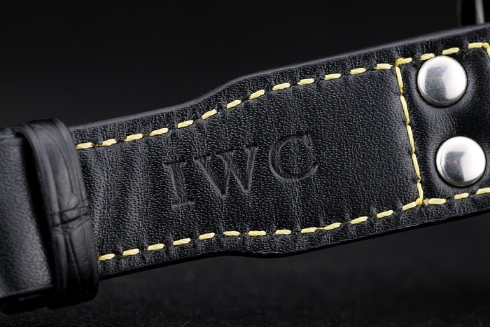 Armbånd: IWC varme præget sort krokodille læderrem med gul sømning tråd og IWC indgraveret ionplettet rustfrit stål Hook-Buckle Clasp