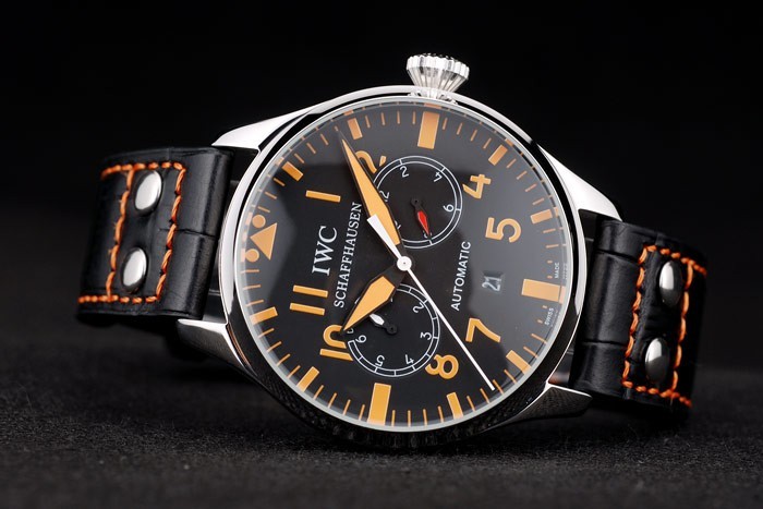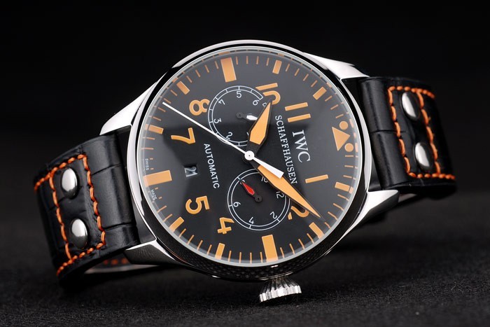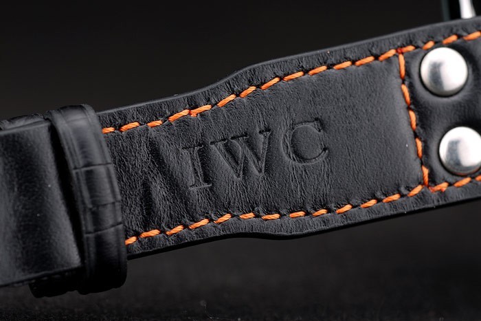 Armbånd: IWC varme præget sort krokodille læderrem med orange sømning tråd og indgraveret børstet rustfrit stål hook-iwc lås