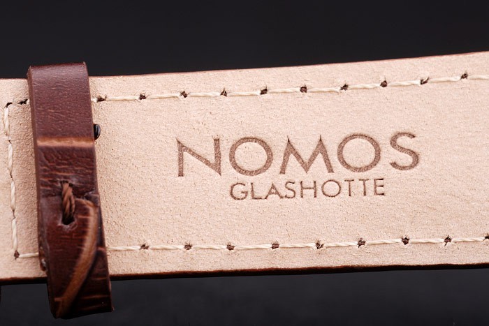 armbånd: varme præget nomos glashutte brun krokodille læderrem med indgraveret rustfrit stål kroge nomos-buckle lås