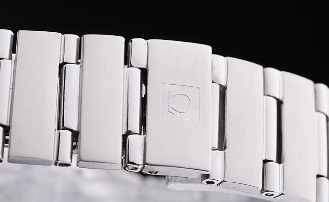 Armbånd: Børstet og poleret rustfrit stål link armbånd med omega indskrift fold-in lås