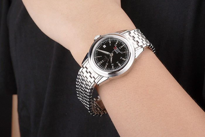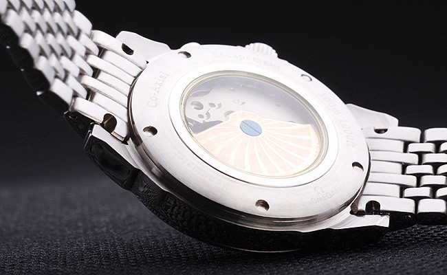 Tilbage: Rustfrit stål Push-In Case tilbage med Omega Inscriptions og Transparent Center viser, at mekanikerne inden for Køn: Mænd