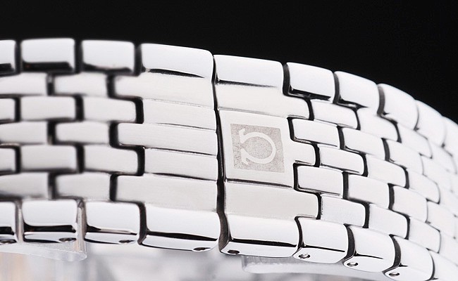 armbånd: børstet og poleret rustfrit stål link armbånd med omega logo indgraveret skjult lås