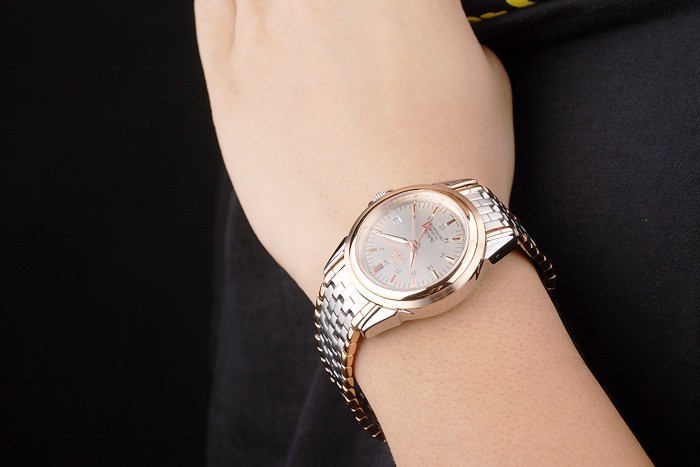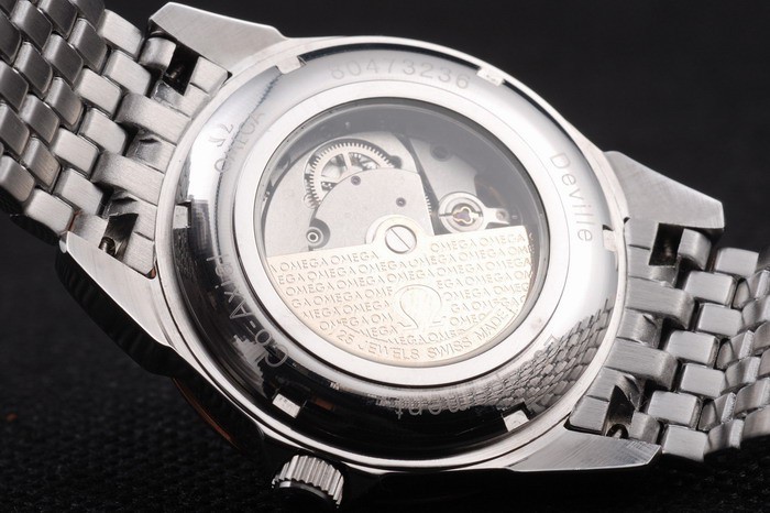Tilbage: Rustfrit stål push-i tilfælde tilbage med omega-påskrifter og transparent center viser, at mekanikerne inden for Køn: Mænd
