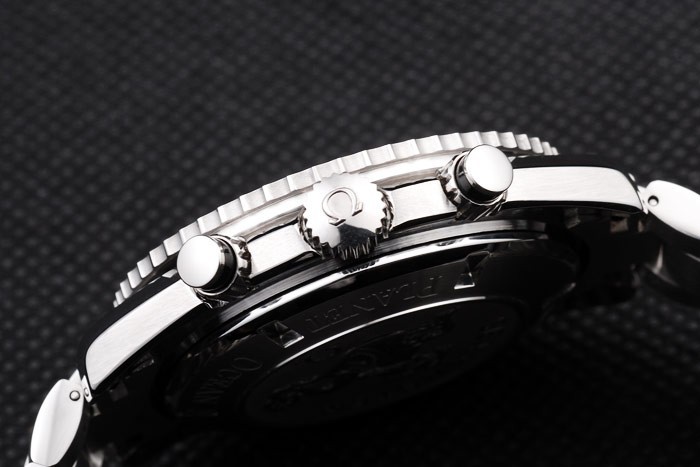 Crown: Børstet rustfrit stål cutwork krone med omega logo plus en ekstra krone på det modsatte øverste hjørne