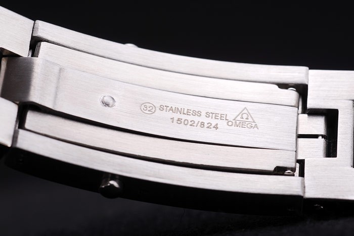Crown: Poleret rustfrit stål Cutwork Crown med Omega logo plus en anden lignende krone på det modsatte øverste hjørne