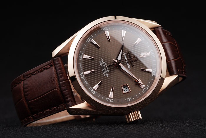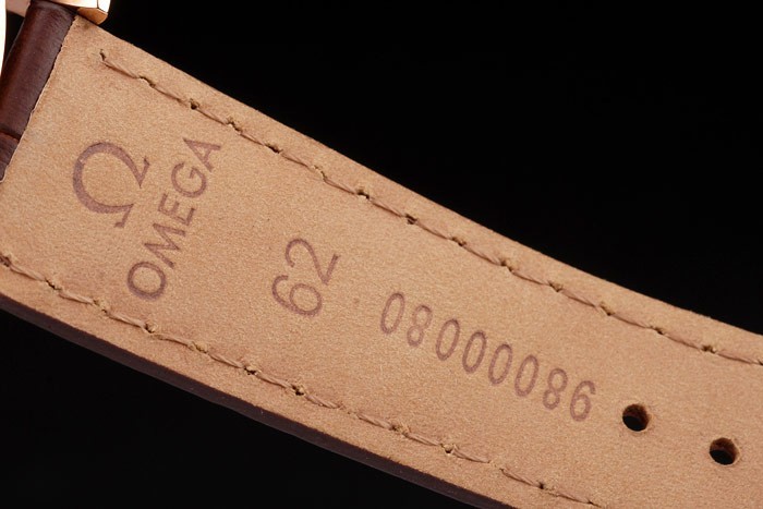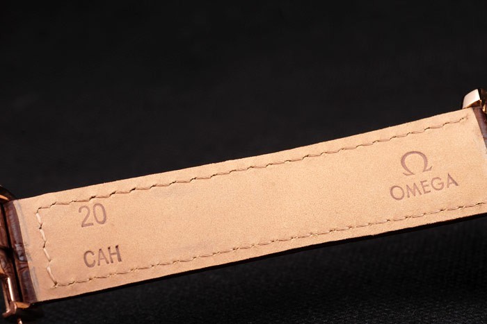 Armbånd: Brun krokodille Læderrem med varmeprægede Omega Stempel og Omega Indskrevet 18k Rose-Guld Fold-in Clasp