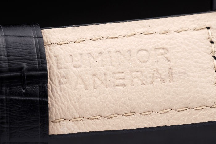 Armbånd: Sort Crocodile Læderrem med varmeprægede Luminor Panerai Stempel og Ionplettet rustfrit stål Hook-Buckle Clasp med Panerai Gravering