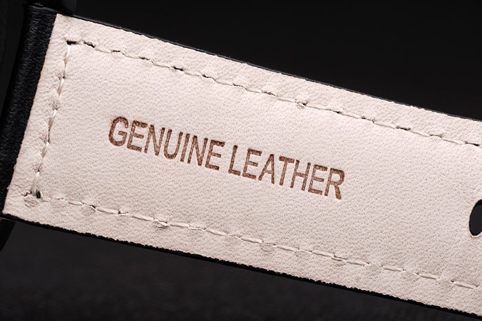 Armbånd: Sort Læderrem med varmeprægede Luminor Panerai Stempel og Ionplettet Rustfrit Stål Hook-Buckle Clasp Med Panerai Gravering