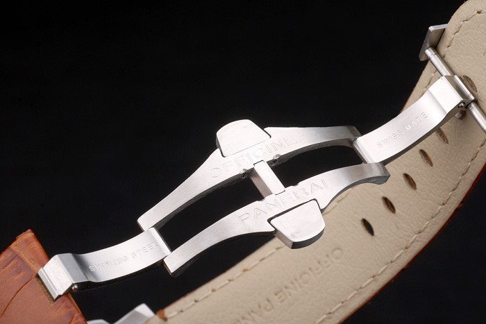 Armbånd: Brun læderrem med varmeprægede værksteder Panerai Italien Stempel og børstet rustfrit stål Fold-in kroge lås med Panerai Gravure