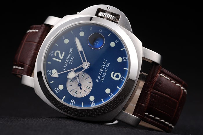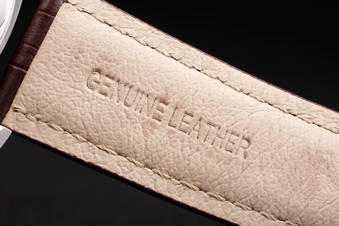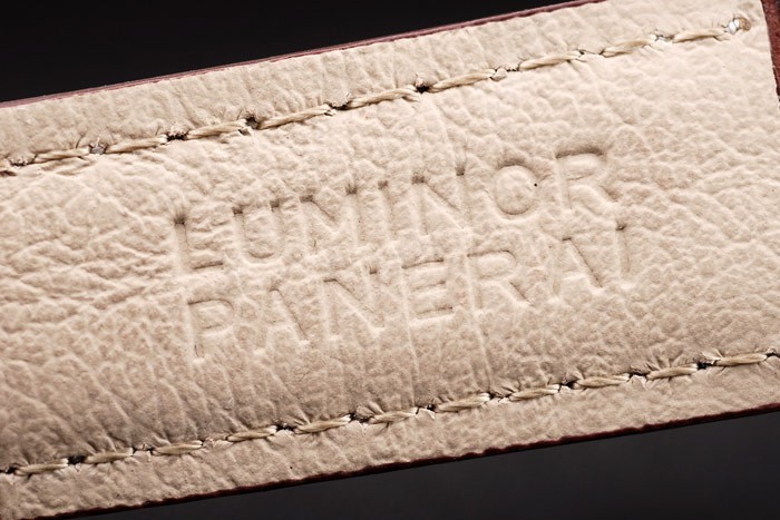 Armbånd: Brun læderrem med hvidt søm og varmeprægede Luminor Panerai Stempel og poleret rustfrit stål Hook-buklængde med Panerai Gravering