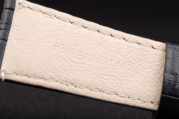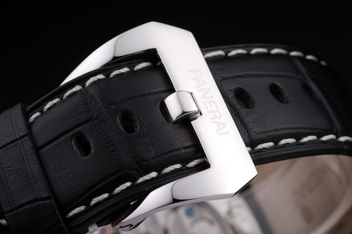 Armbånd: Sort Crocodile Læderrem med hvide søm og varmeprægede værksteder Panerai ITALIEN Stempel og poleret rustfrit stål Hook-Buckle Clasp med Panerai Gravering