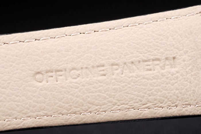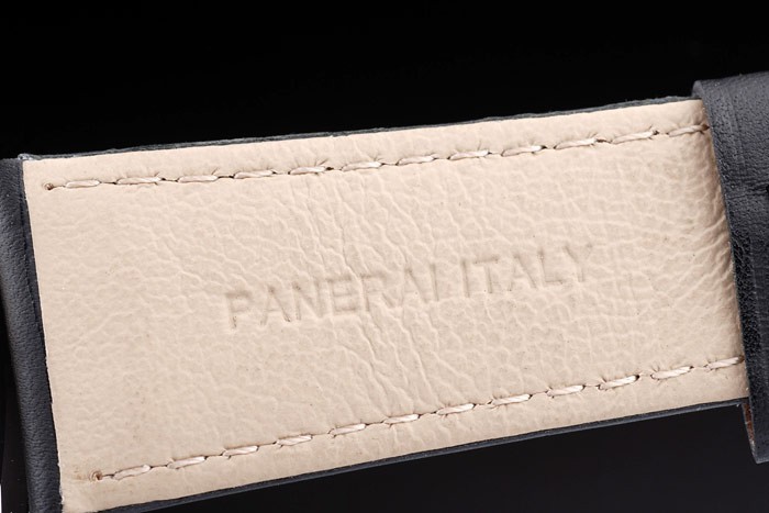Armbånd: Sort Crocodile Læderrem med hvide søm og varmeprægede værksteder Panerai Italien Stempel og Poleret rustfrit stål Hook-Buckle Clasp Med Panerai Gravering