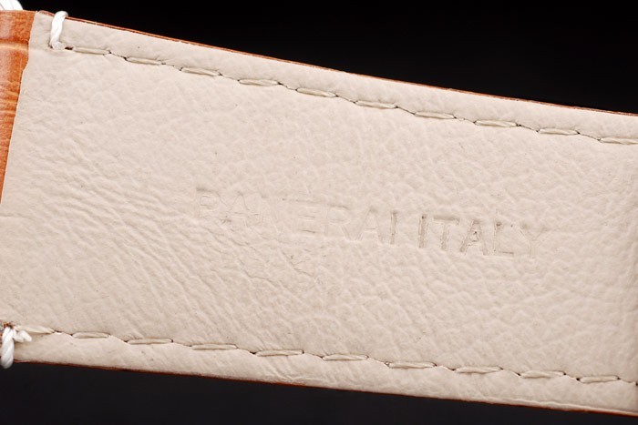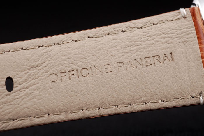 Armbånd: Brun krokodille Læderrem med hvide søm og varmeprægede værksteder Panerai ITALIEN Stempel og poleret rustfrit stål Hook-Buckle Clasp med Panerai Gravering
