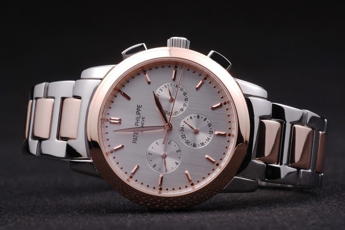 Armbånd: Poleret rustfrit stål og Rose Gold Link Armbånd med skjult lås og Patek Philippe Marking