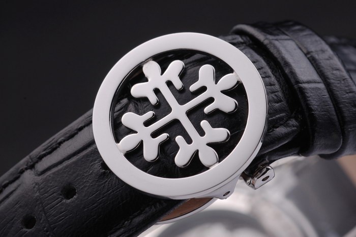 Armbånd: Sort Læderrem med Patek Philippe Stempel og en rustfrit stål Fold i lås