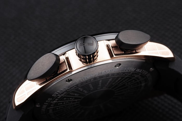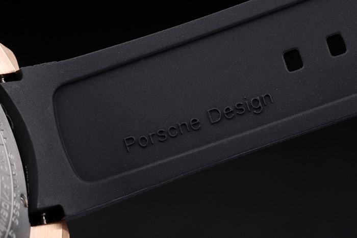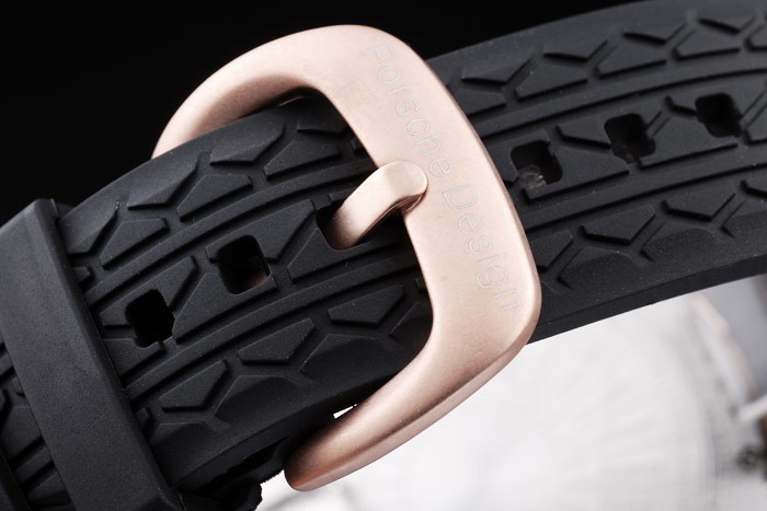 Armbånd: Tire-Groove Sort Gummirem Med varmeprægede Porsche Stempel og Rose-Gold Hook-Buckle Clasp med Porsche Inscription