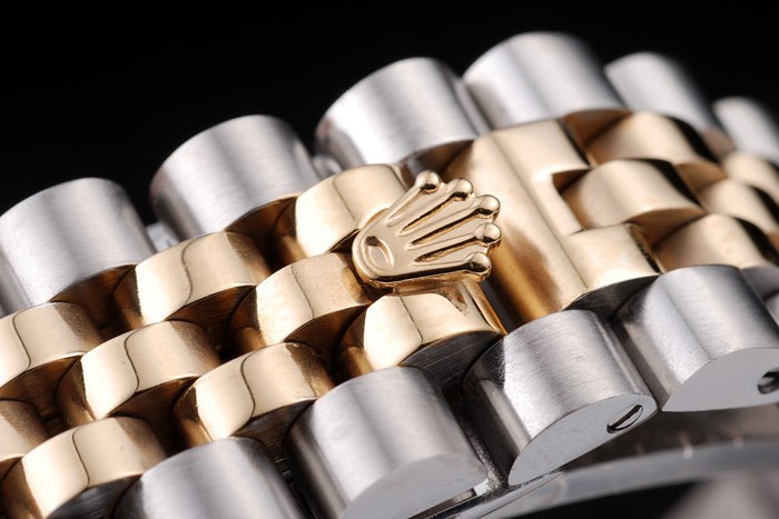 Armbånd: To tonet linkarmbånd i børstet rustfrit stål og 18k gul forgyldt stål med Rolex indgraveret skjult lås, der viser Rolex-logoet