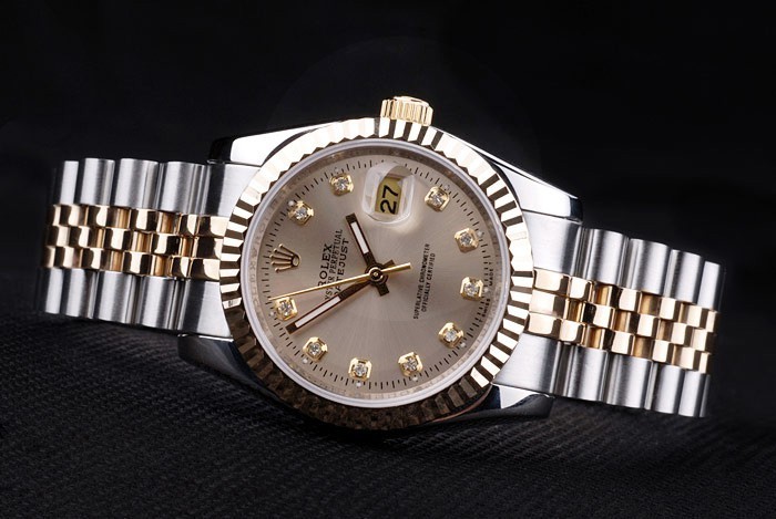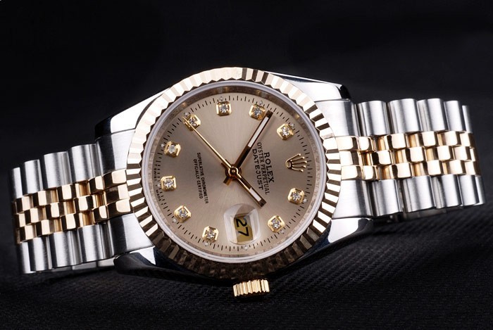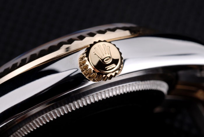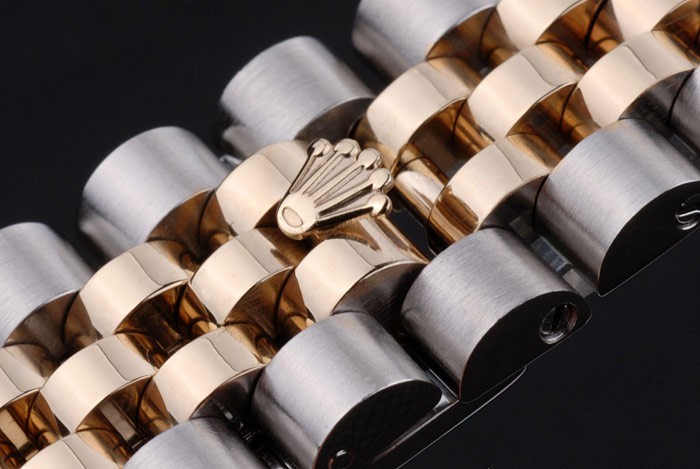 Armbånd: To tonet linkarmbånd i poleret rustfrit stål og 18k gul forgyldt stål med Rolex gravering skjult lås, der viser Rolex-logoet