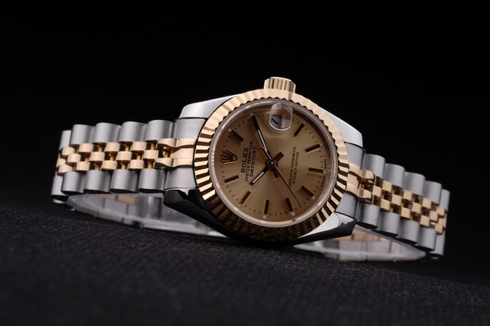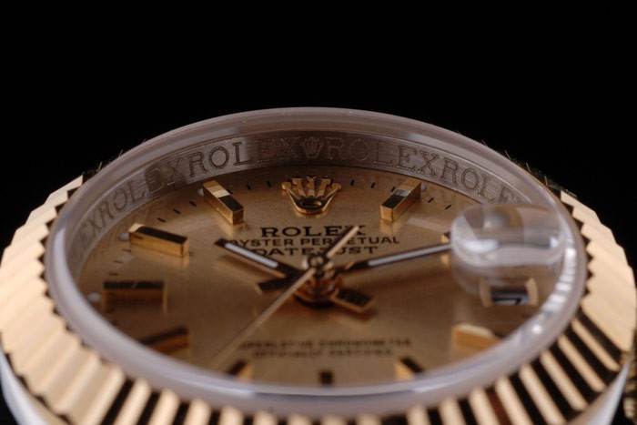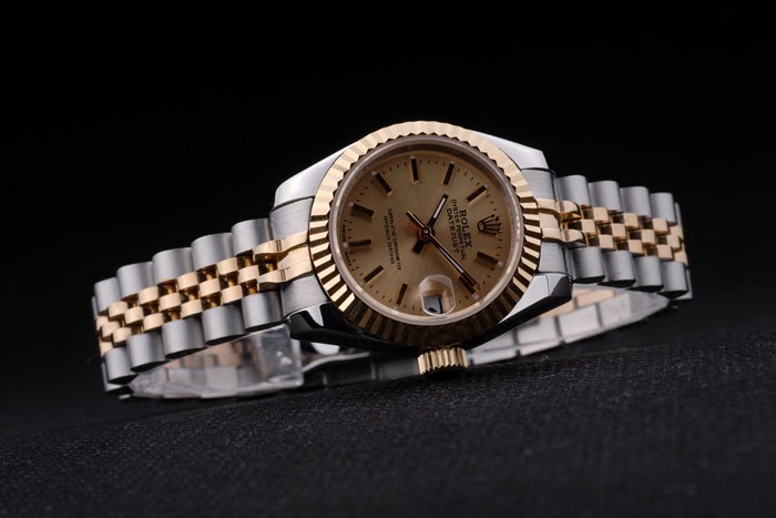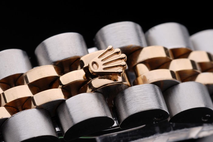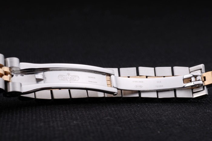 Armbånd: To tonet linkarmbånd i poleret rustfrit stål og 18k gul forgyldt stål med Rolex gravering skjult lås, der viser Rolex-logoet