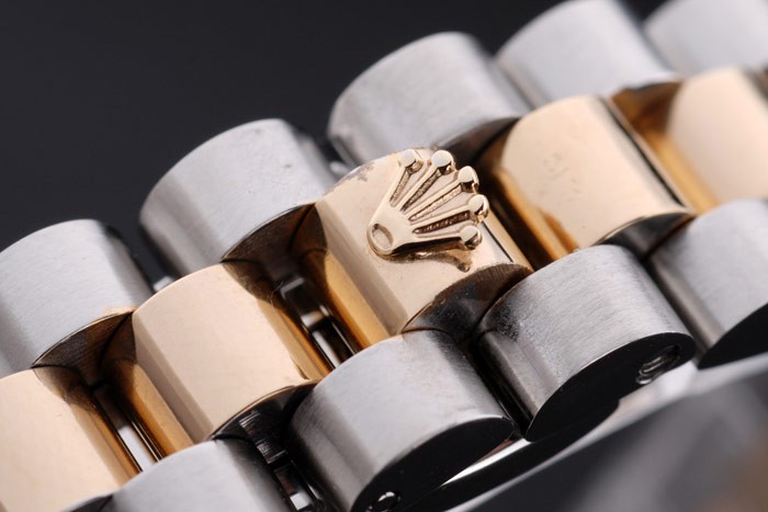 Armbånd: To tonet tredobbelt linkarmbånd i poleret rustfrit stål og 18K Gult forgyldt stål med Rolex Gravering Hidden Clasp Visning af Rolex Logo