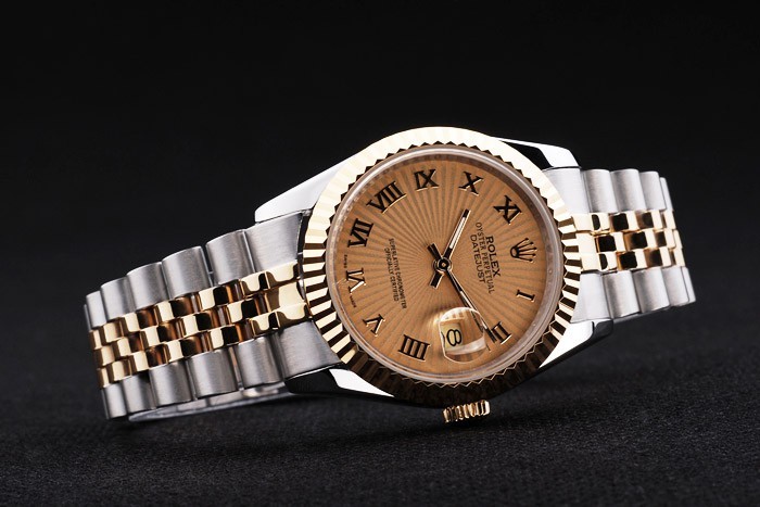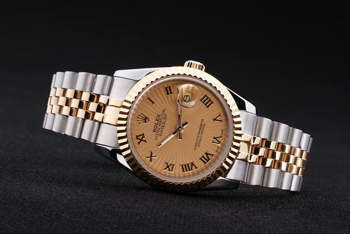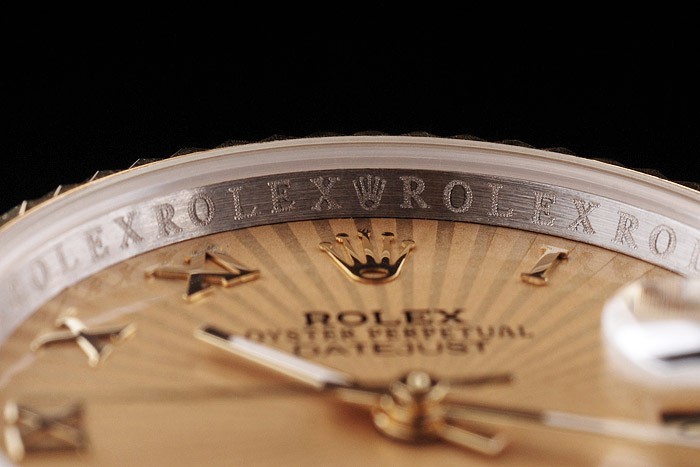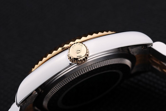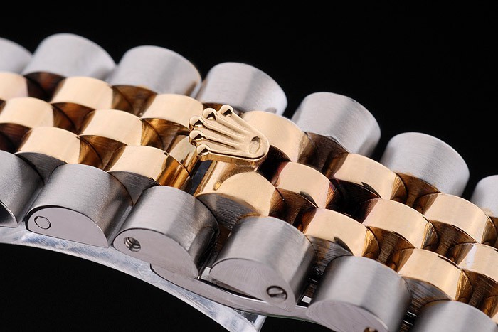 Armbånd: To tonet linkarmbånd i børstet rustfrit stål og 18k gult forgyldt stål med Rolex gravering skjult lås, der viser Rolex Logo