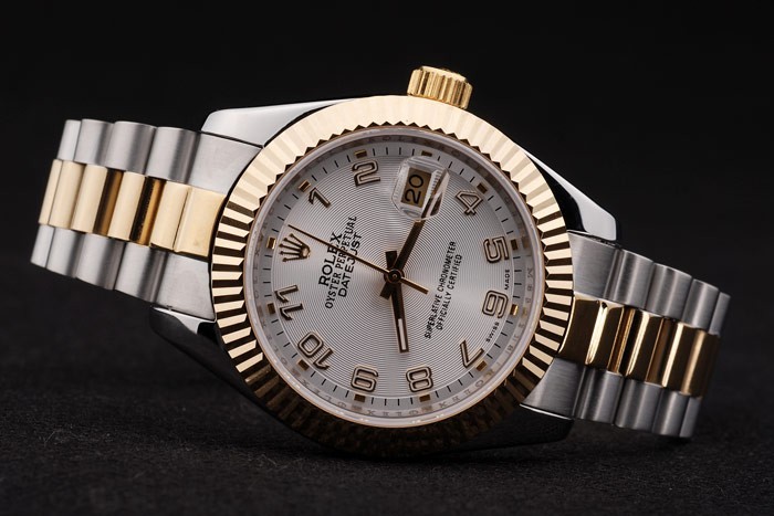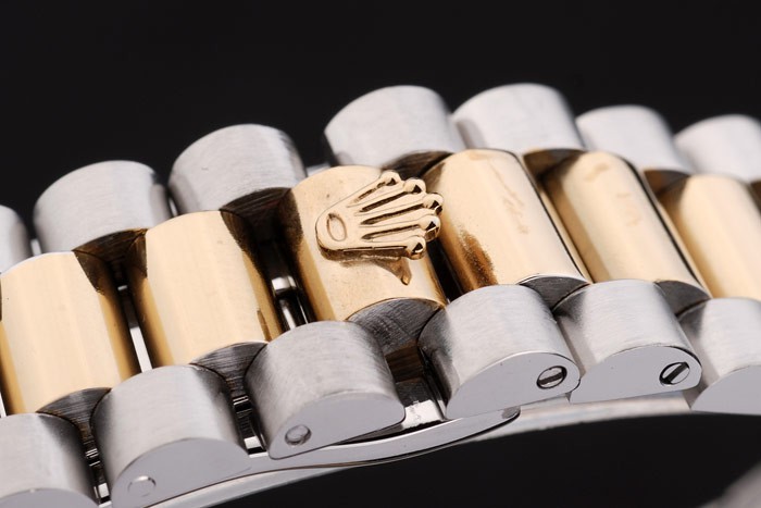 Armbånd: Børstet rustfrit stål og gul Guldkæde med fold over lås og Rolex Krongravering